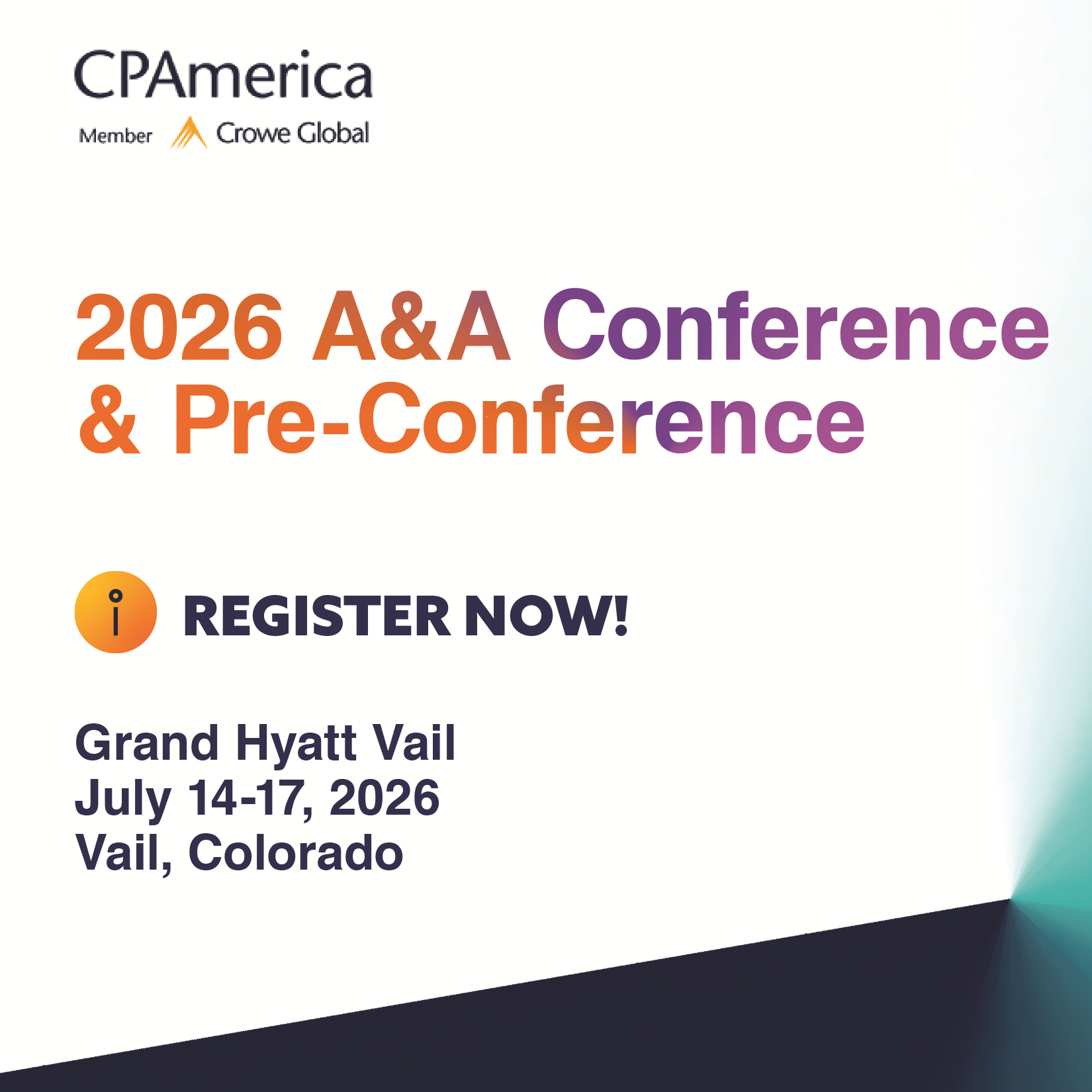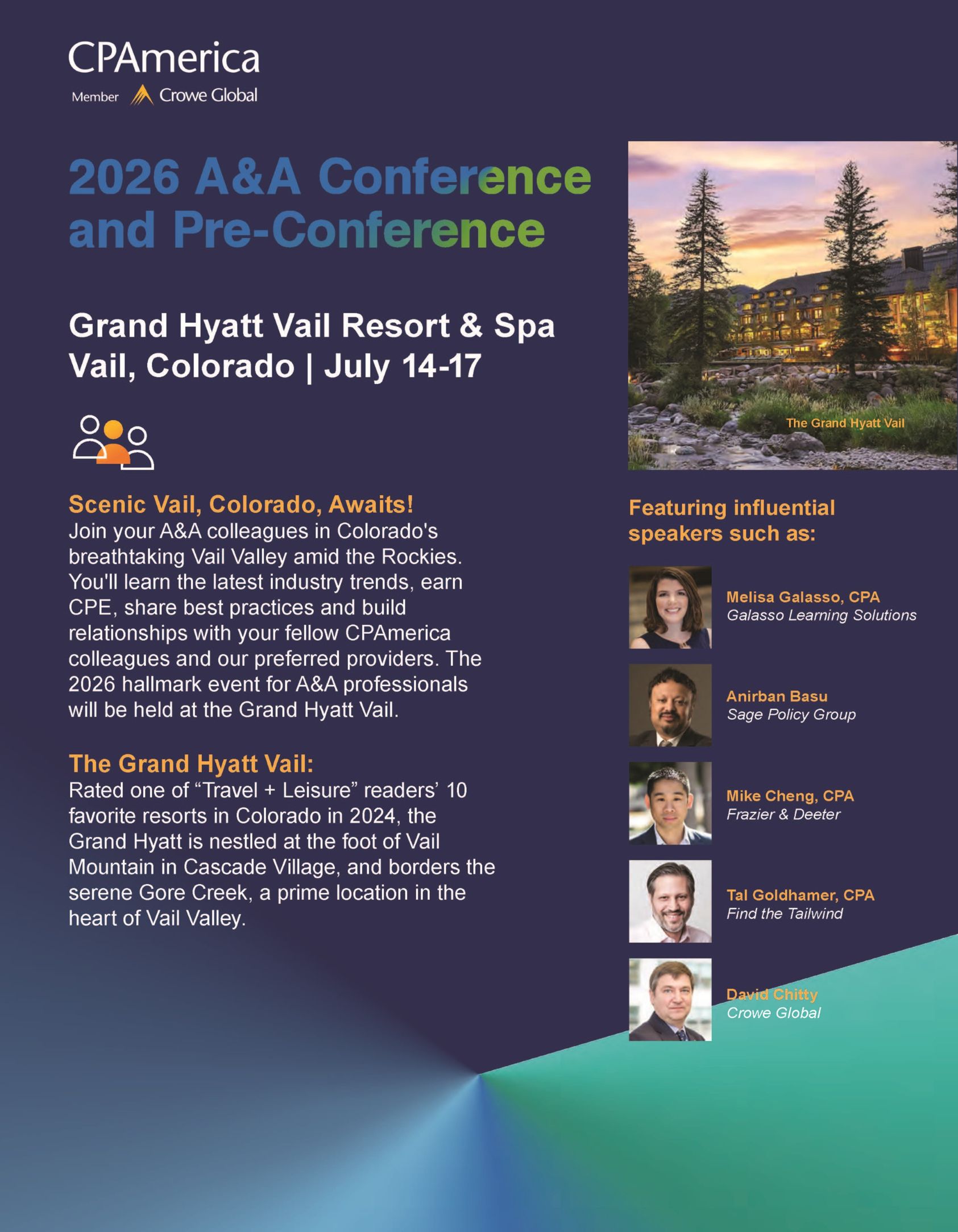 Join your A&A colleagues in Colorado’s breathtaking Vail Valley amid the Rockies. You’ll learn the latest industry trends, earn CPE, share best practices and build relationships with your fellow CPAmerica colleagues and our preferred providers. The 2026 hallmark event for A&A professionals will be held at the Grand Hyatt Vail.