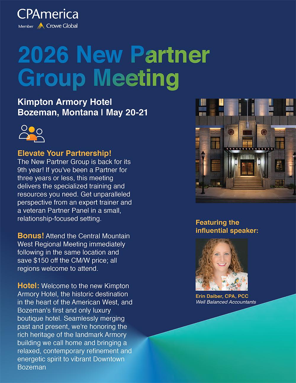 Don’t miss the 2026 New Partner Meeting, May 20-21 in Bozeman, Montana! This meeting is best suited for new partners in their role three years or less.