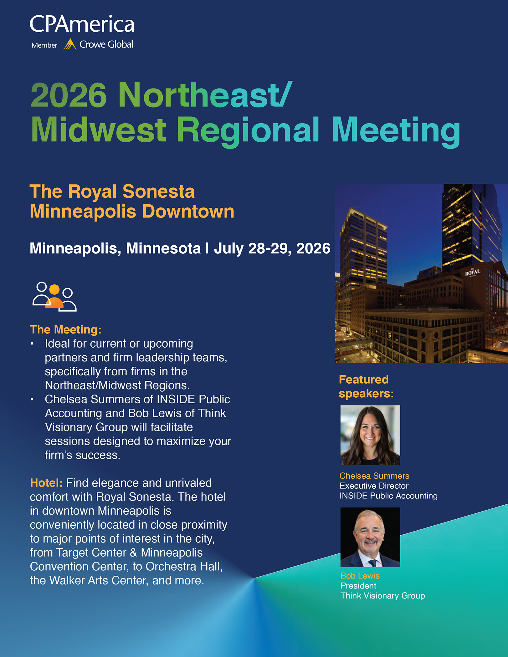 Join us for two days of sharing with your partners from the Midwest and Northeast Region. This meeting is recommended for current or upcoming partners, CEOs, COOs or Firm Administrators.